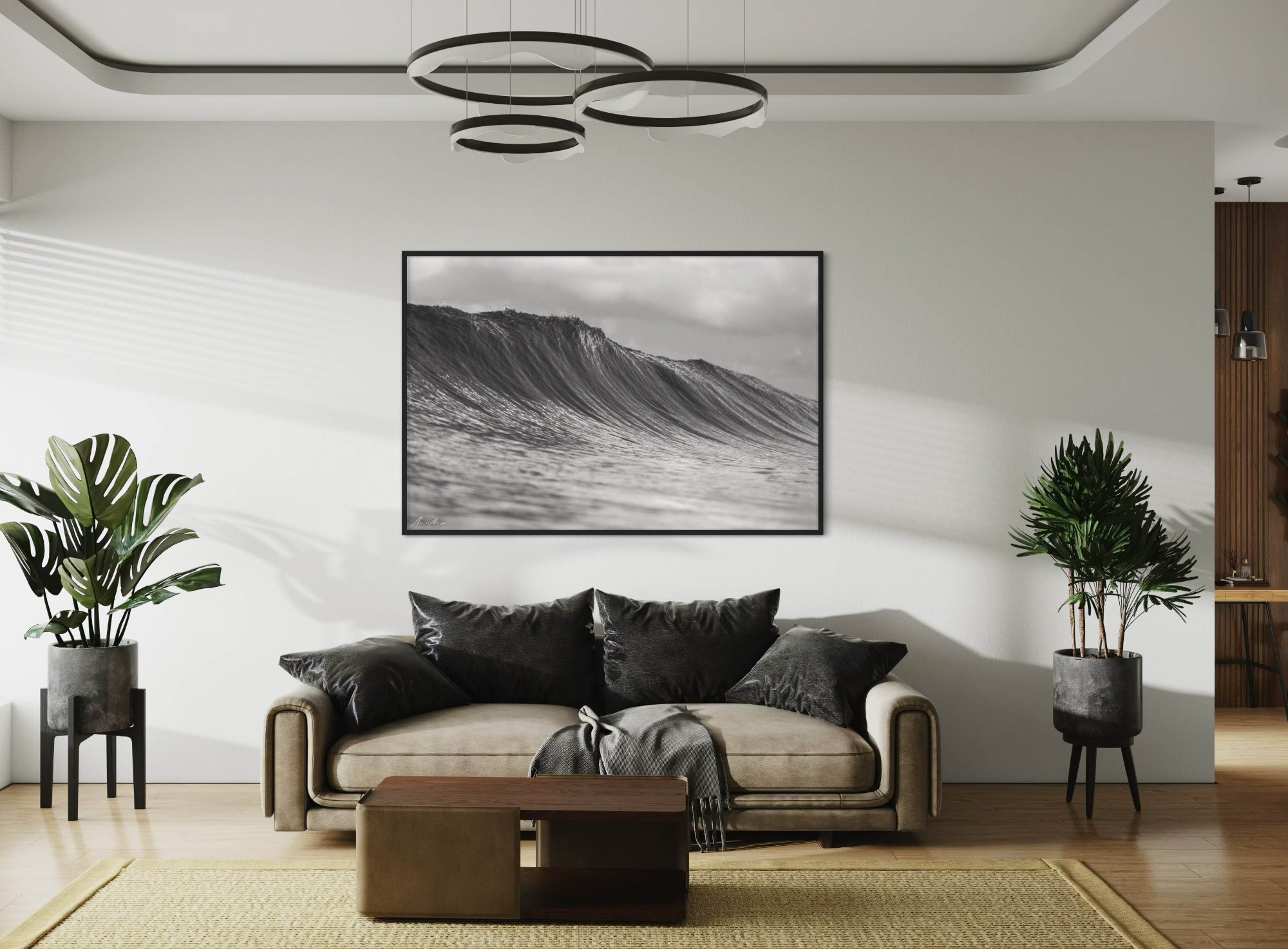 בגב התמונה ישנה מסגרת אלומיניום היוצרת הרחקה מהקיר, ומעניקה תחושה של תמונה צפה.